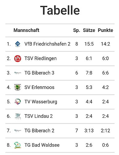 Es sollte jedoch der einzige Ausrutscher bleiben. Zwar konnte man auch in den beiden weiteren Partien selten spielerisch glänzen, die Punkte landeten sowohl beim 2:1 (11:3/9:11/11:7) Erfolg gegen den TV Wasserburg wie auch beim abschließenden 2:1 (8:11/11:6/11:5) Sieg über den SV Erlenmoos auf dem Konto des VfB Friedrichshafen.