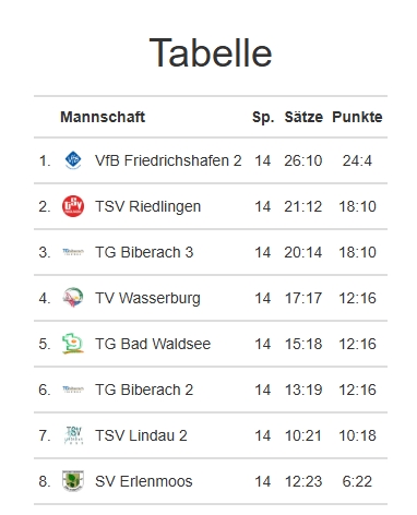 Auch in der letzten Partie gegen Tabellennachbar SV Oberböhringen legte der VfB wieder vor. Als man im dritten Satz durchwechselte, litt der Spielfluss spürbar und die Gäste konnten den Anschluss herstellen. Anders als gegen Allmendingen kamen die Seehasen diesmal zurück ins Spiel und sicherten sich zum Abschluss einer schwierigen Spielzeit einen verdienten 3:1 (11:4/11:4/9:11/11:8) Sieg.